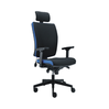 Kancelářská židle disponuje fixním čalouněným opěradlem s podhlavníkem potaženým šedou látkou.